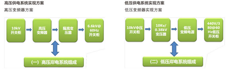 船舶靠岸后如果使用岸电电源的话,电源需要输出50Hz和60Hz两个频率,且电压可以调节来适应各国船舶电压等级的不同。